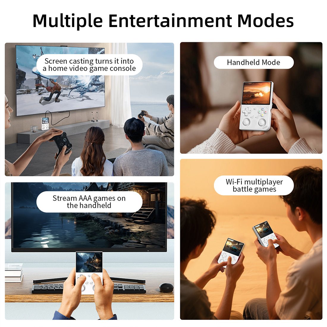 .Wide Game Compatibility & Versatile Connectivity: Supports a broad range of classic game formats including PSP, PS1, Dreamcast, NDS, Arcade, GBA, GB, SNES, NES, MAME, and more-allowing you to load and enjoy your favorite titles freely. Compatible with 2.4G wireless, wired, and Bluetooth controllers, with HDMI TV output, built-in vibration motor, and WiFi online play support. Stream AAA games and connect with ease for an upgraded handheld gaming experience.