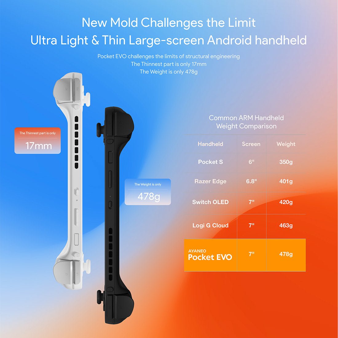 .Portable & Versatile Ergonomic Design: Weighing just 478g and only 17mm thick, the Pocket EVO is built for portability without compromising comfort. Its customizable control layout includes D-pad, ABXY buttons, Hall-effect joystick, multi-function touchpad, and responsive shoulder buttons — perfect for everything from retro arcade games to modern 3D titles.