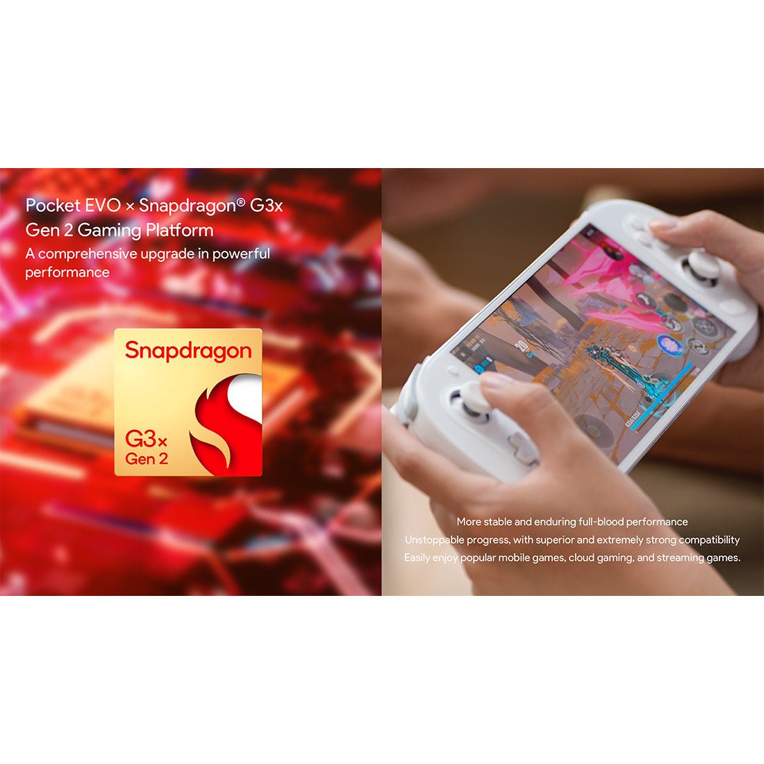 .Powerful Snapdragon G3x Gen 2 Processor: Powered by the cutting-edge Snapdragon G3x Gen 2 chipset built on a 4nm process, the Pocket EVO offers up to 15W performance. Paired with LPDDR5X RAM and UFS 4.0 storage, it ensures fast loading times and fluid gameplay for Android and emulated titles alike.