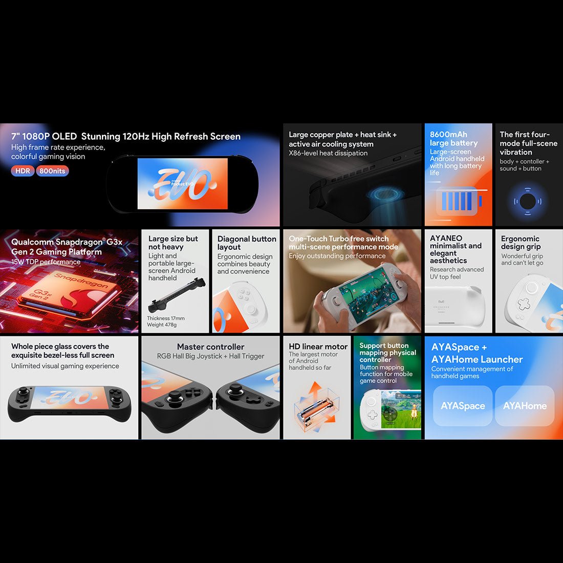 .Stunning 7-Inch OLED Display with High Refresh Rate: The AYANEO Pocket EVO features a vibrant 7" OLED screen with a 1920×1080 resolution and an ultra-sharp 315 PPI. Enjoy buttery-smooth gameplay with up to 165Hz refresh rate and HDR support. Peak brightness reaches 800 nits, delivering vivid colors and excellent clarity. A super-slim bezel and ergonomic design complete this premium visual experience.