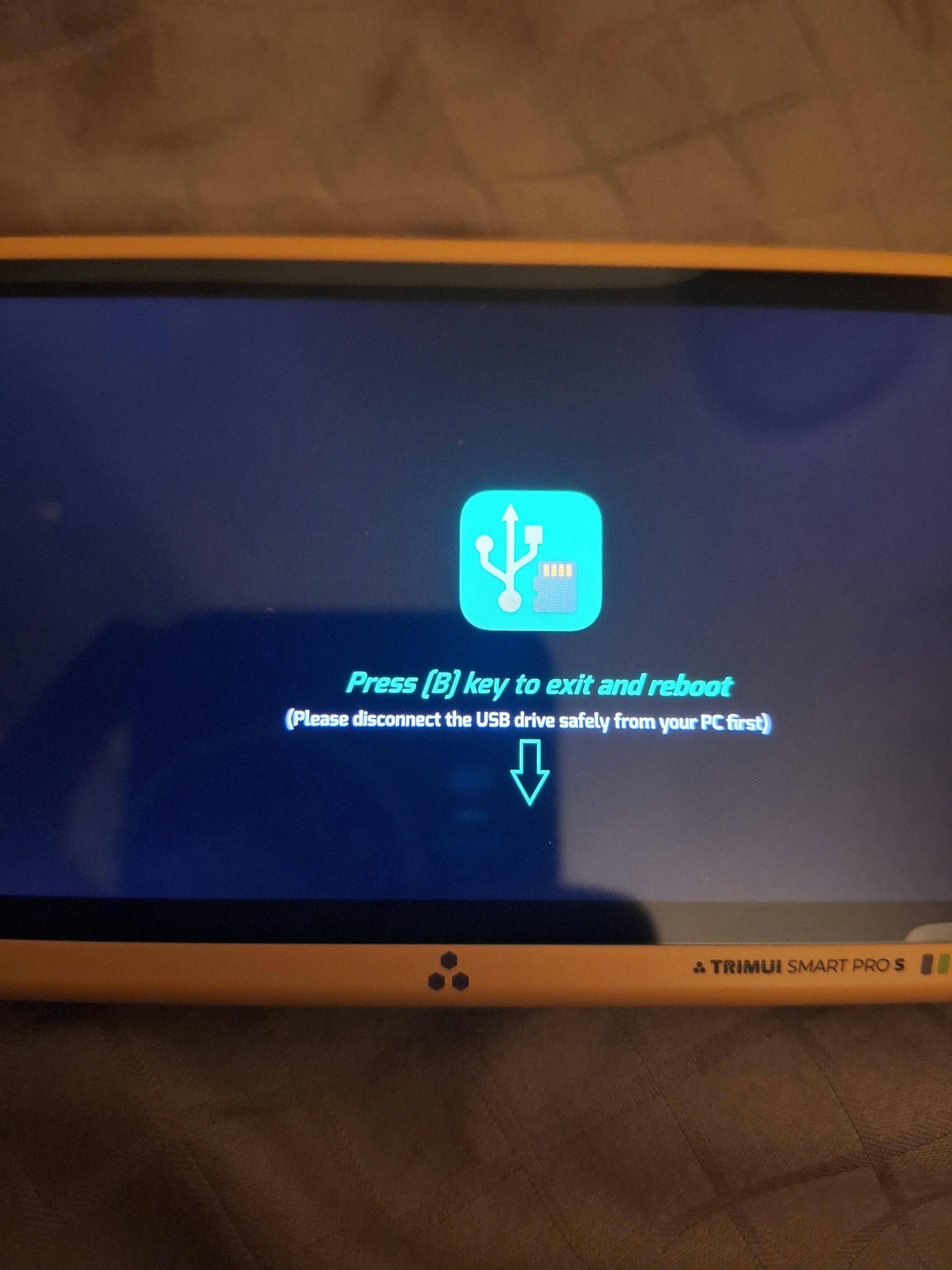 1. The USB Storage app crashed after the first time I launched it. Since then it just displays a screen that says to press B to disconnect, but B doesn't do anything. In fact, the only way I've found to exit the screen is through the reset button on the bottom of the device.