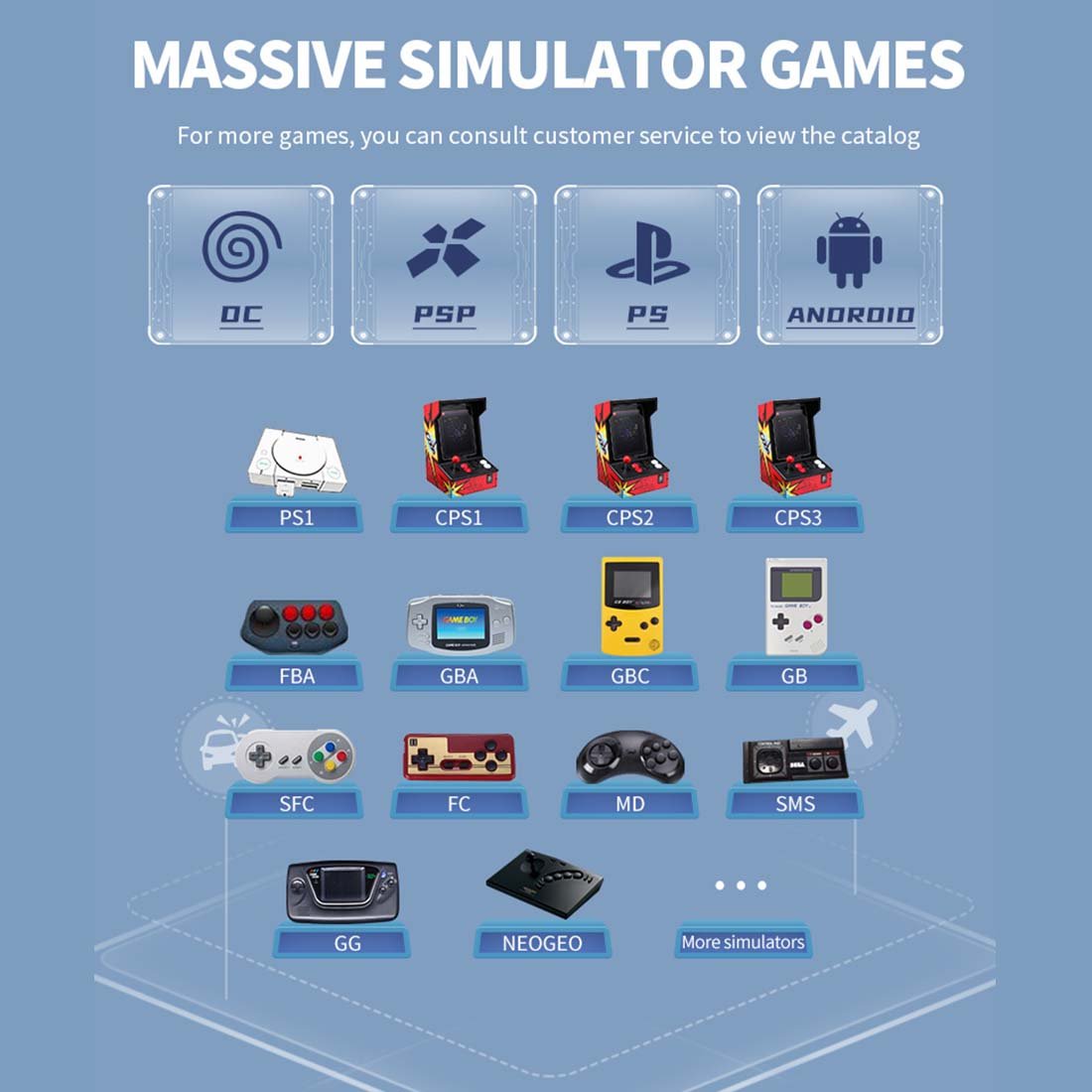 🎮Multiple simulators-- Compatible with several simulators, such as GAMECUBE, PSP, PS, MD, SFC, GBC, GBA, DC, MAME, PCE, WSC, N64, and so on.